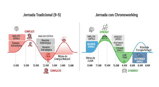 El chronoworking alinea las tareas con tus picos de energía, mientras que el horario tradicional a menudo crea un conflicto entre las demandas laborales y tu ritmo biológico.