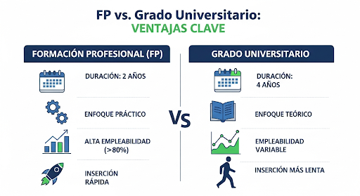 Comparativa visual de las ventajas clave de la Formación Profesional frente a un Grado Universitario en términos de duración, enfoque y resultados laborales.