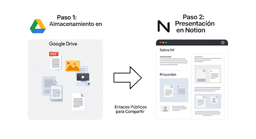Este diagrama ilustra el flujo de trabajo: Google Drive se utiliza para almacenar los archivos de tus proyectos, mientras que Notion funciona como la página de presentación que enlaza a esas pruebas de trabajo.