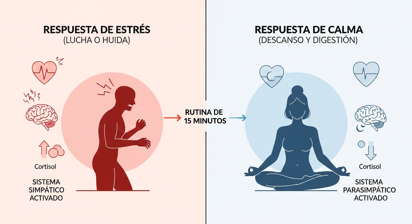 Tu rutina de 15 minutos ayuda a cambiar la respuesta de 'lucha o huida' de tu cuerpo por una de 'descanso y digestión', reduciendo activamente los indicadores fisiológicos del estrés.